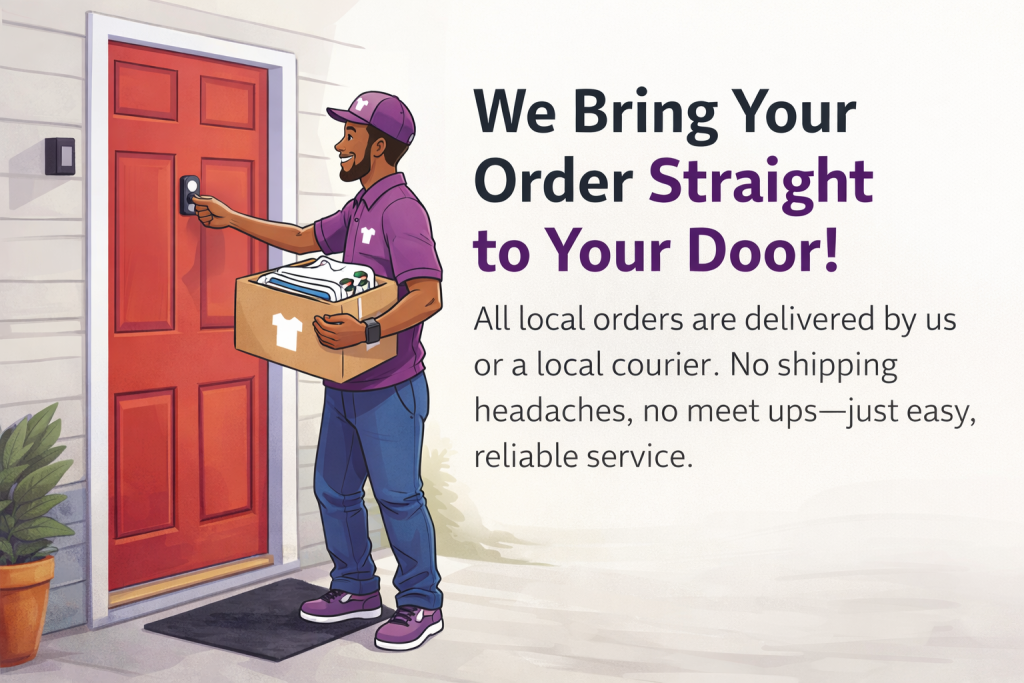 High-quality custom t-shirt printing with a fast 1-week turnaround. We provide local courier delivery throughout Dallas—no pickups, no headaches.
